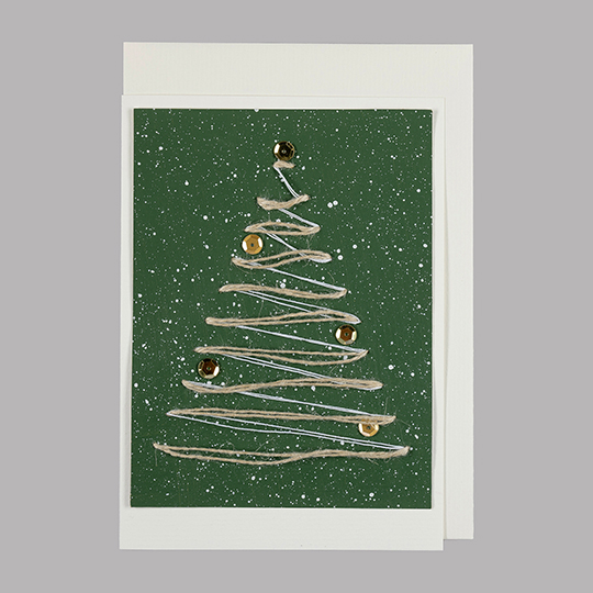 Tannenbaum aus weissem und braunem Garn, verziert mit goldenen Pailletten, aufgestickt auf handbemaltem tannengrünem Hintergrund mit Schneegestöber. Karte: Ivory